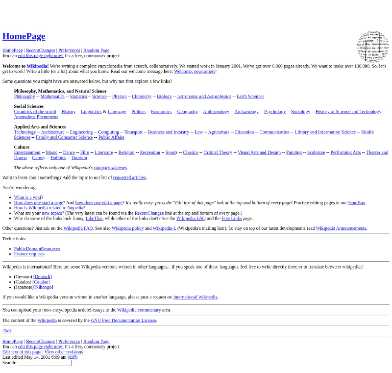 Wikipedia, didirikan oleh Jimmy Wales dan Larry Sanger pada 2001, menjadi ensiklopedia daring terbesar di dunia. Dengan markup XHTML yang rapi, Wikipedia mampu mengelola jutaan artikel dari kontributor global. Pada 2005, Wikipedia telah memiliki lebih dari 750 ribu artikel, melampaui Encyclopaedia Britannica dalam jumlah entri.