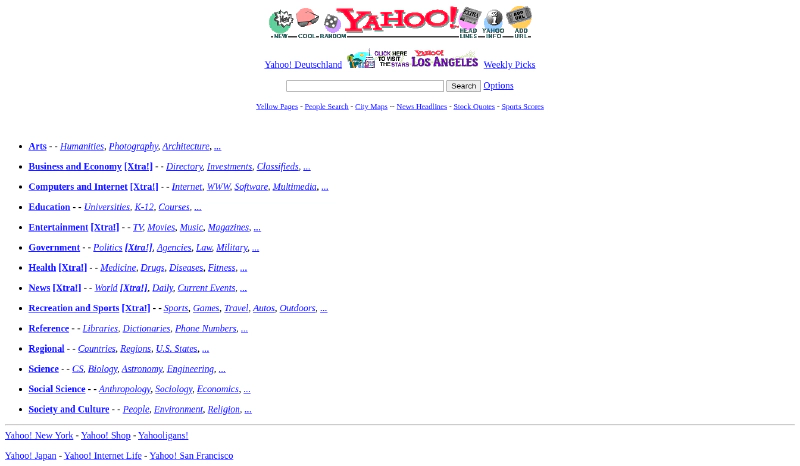 Salah satu kisah sukses terbesar di era ini adalah Yahoo!, yang didirikan oleh Jerry Yang dan David Filo pada 1994. Awalnya, Yahoo! hanyalah sebuah direktori berisi daftar link ke situs web favorit mereka. Namun dengan HTML 2.0, Yahoo! mampu menambahkan form pencarian yang memungkinkan pengguna mencari situs web sesuai kategori.
