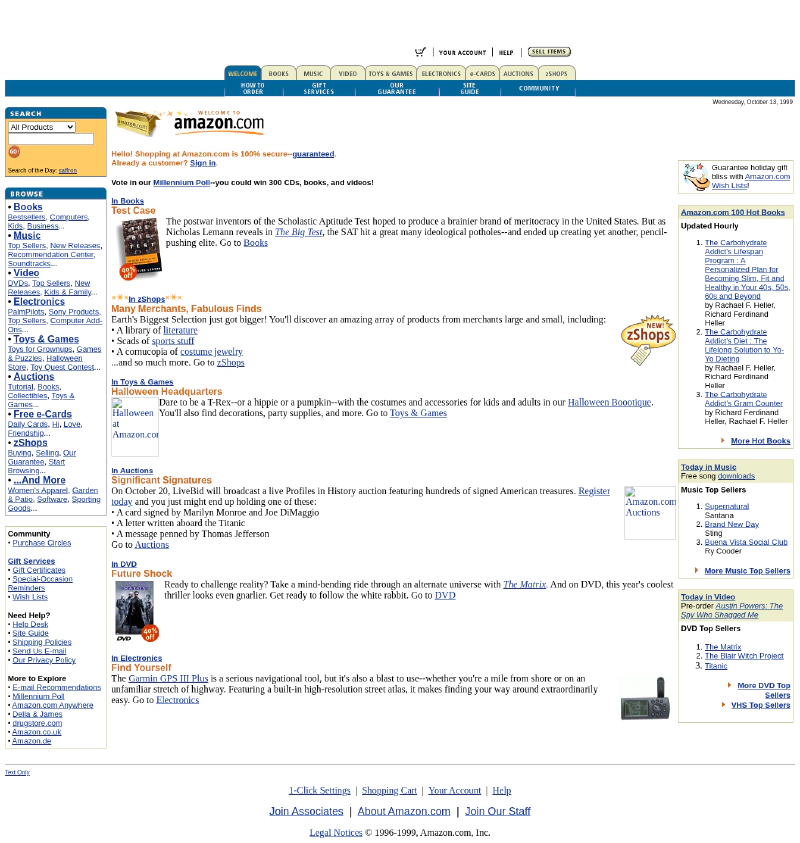 Kisah sukses terbesar pada fase ini adalah Amazon, didirikan oleh Jeff Bezos pada 1994. Pada awalnya Amazon hanyalah sebuah toko buku online, Amazon dengan cepat mengadopsi HTML 4.01 untuk memperluas fitur. Amazon mulai mengembangkan fitur katalog produk, sistem keranjang belanja, dan sistem pembayaran daring.